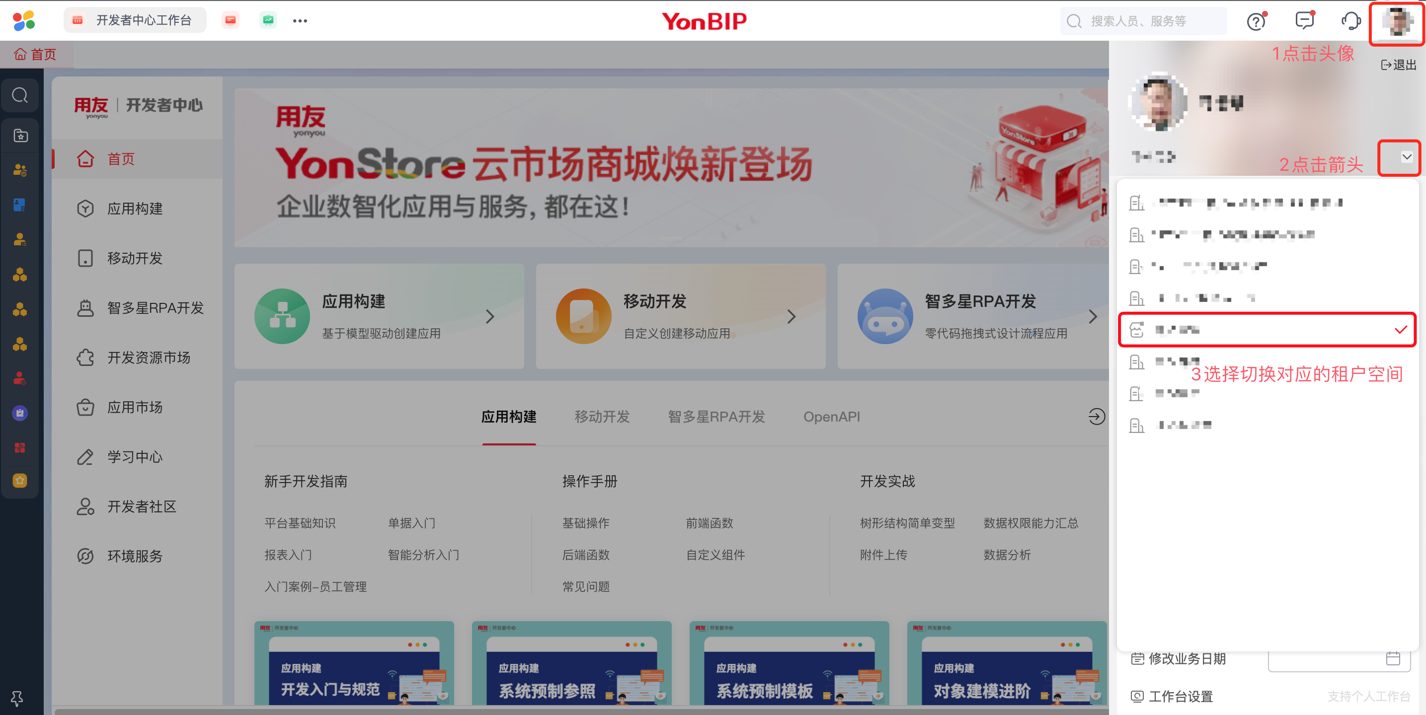通过上面的操作,该名成员已经可以切换到我们的租户空间,并访问「移动开发」控制台了,不过他看不到应用。因为我们还差最后一步,赋予他具体的应用权限。