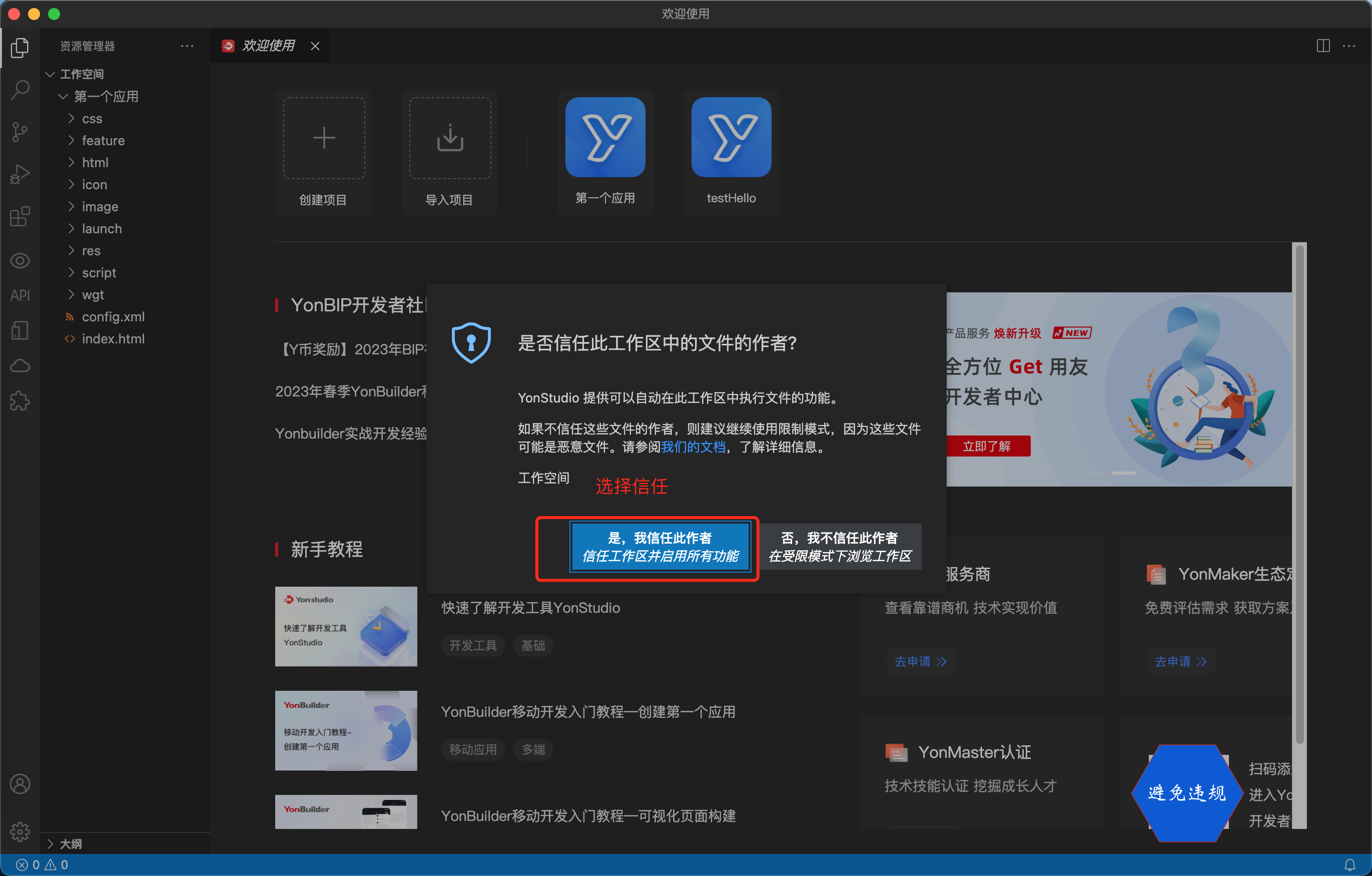 注意 如果弹出了「是否信任此工作区中的文件的作者?」,选择「是, …」这个按钮即可,这个是 VsCode 自身设置的安全机制。