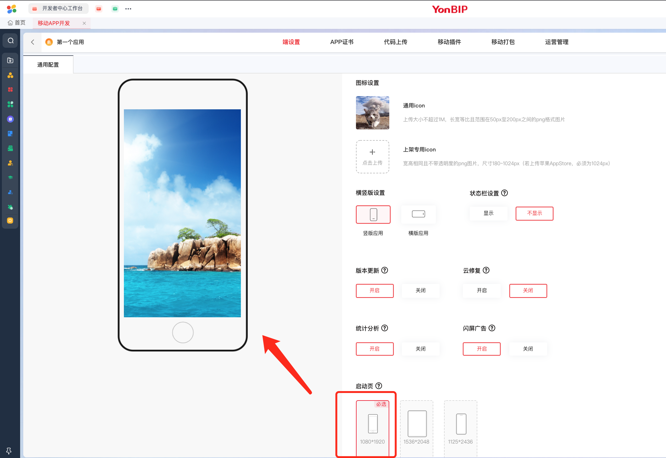 安卓版本通常上传基本的1080*1920即可,鼠标移动到「启动页」选项内左侧第一个方框,点击底部的上传文字按钮,并在弹出的对话框中选择本地的图片文件进行上传。