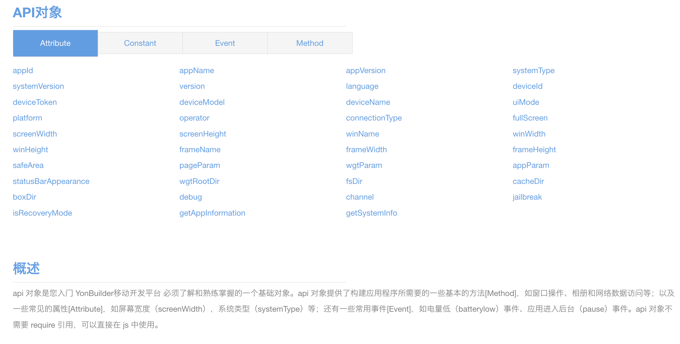 引入apiready函数的最根本原因就是在进行YonBuilder移动开发的时候,我们会根据业务逻辑的需要,频繁的使用到大量的引擎内置的api对象函数方法。