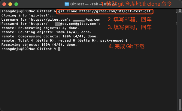 打开本地终端,进入目标文件夹,按以下流程输入命令,完成 Git仓库的 Clone操作。